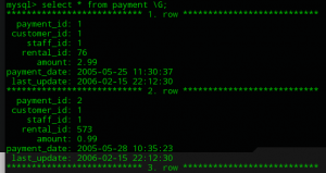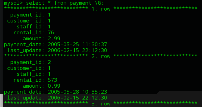 Usando \G al final del comando de consulta se obtiene el resultado en forma de renglones, lo es es visualmente mas cómodo para analizar dichos datos: